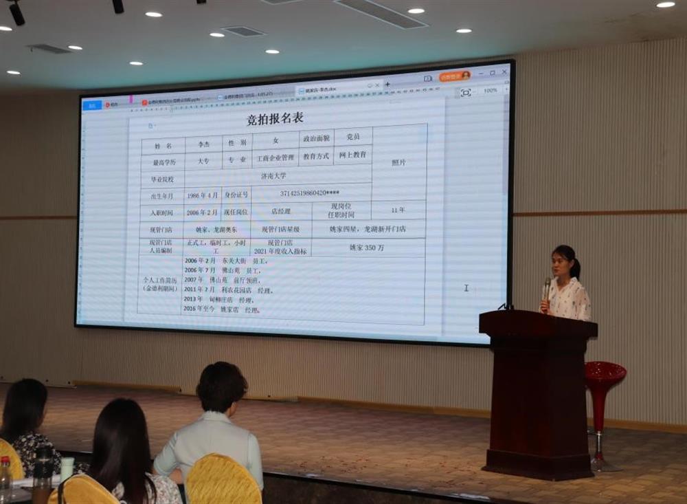 公司成立競拍領(lǐng)導(dǎo)小組,堅持“公開競拍、平等競爭、擇優(yōu)錄取、注重實績”的原則,鼓勵員工毛遂自薦、積極報名。競拍店長依次上臺分別從管理門店2021年度經(jīng)營收入目標(biāo)、競拍上崗后的工作思路、設(shè)想及經(jīng)營措施等方面進行演講。