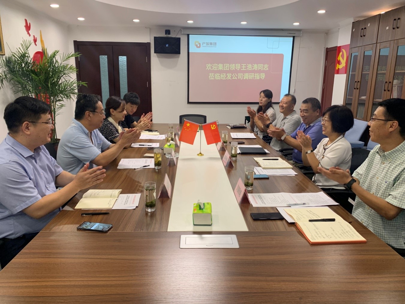 8月5日上午,產(chǎn)發(fā)集團黨委委員、副總經(jīng)理王浩濤同志一行到濟南經(jīng)濟發(fā)展有限公司進(jìn)行調(diào)研。企管集團黨委書記、董事長張欣同志,黨委副書記、總經(jīng)理朱風(fēng)亮同志等陪同調(diào)研。經(jīng)發(fā)公司黨支部書記、執(zhí)行董事長劉濤同志以及經(jīng)發(fā)公司經(jīng)營班子成員迎接調(diào)研并匯報工作。