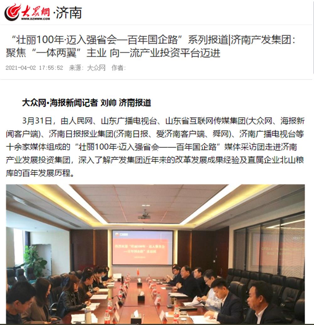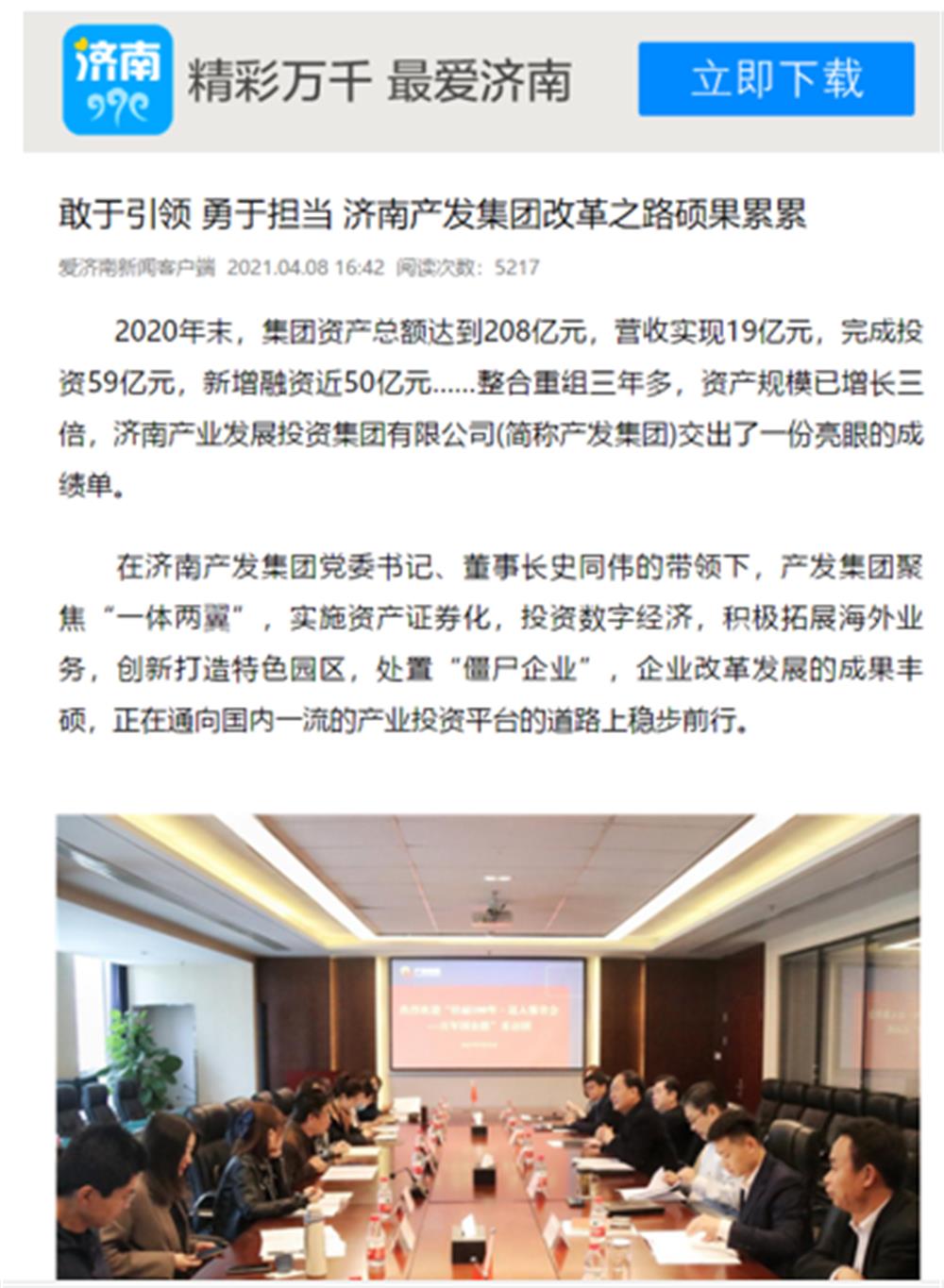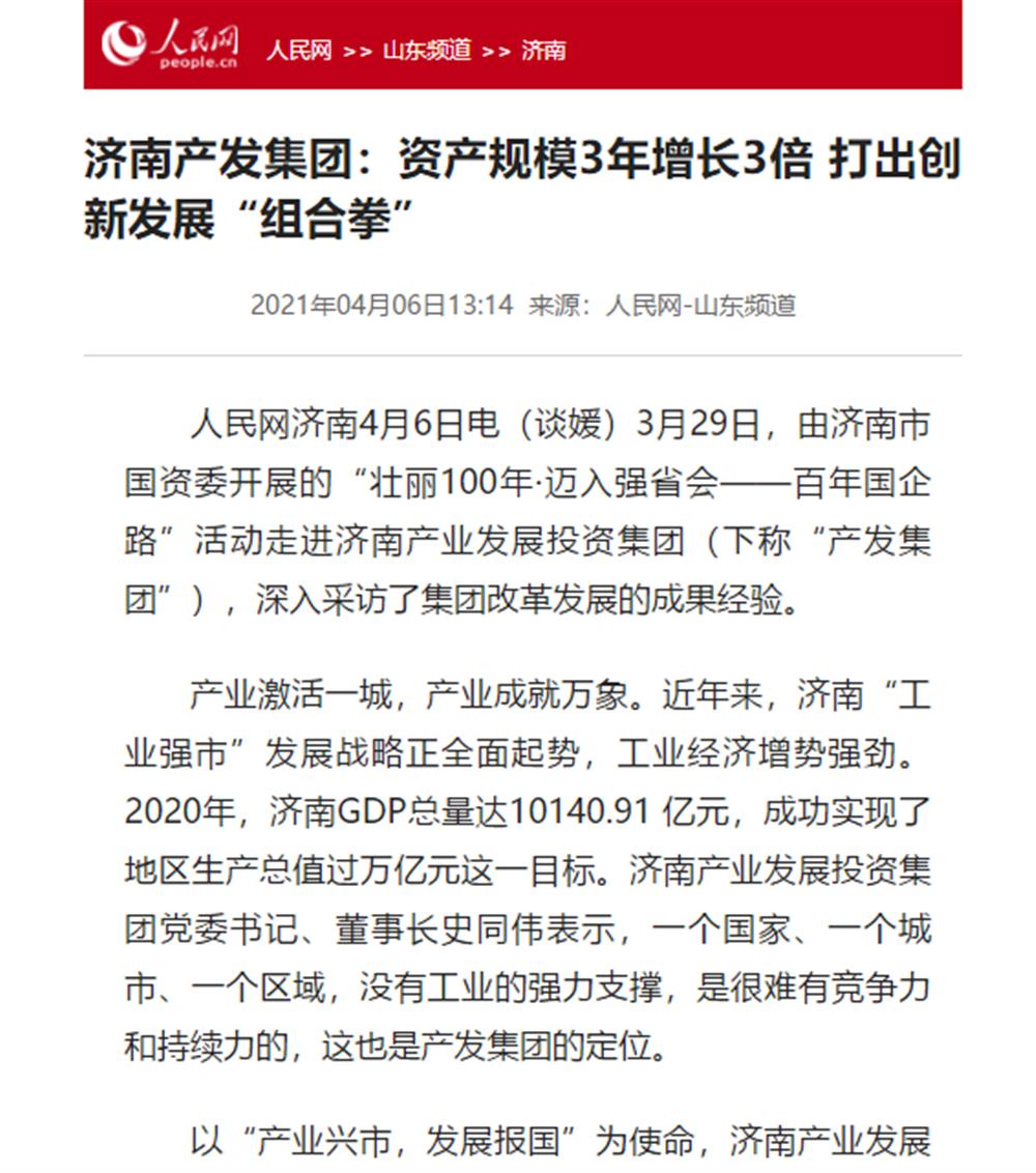 近日,市國資委舉辦的“壯麗100年·邁入強(qiáng)省會——百年國企路”媒體團(tuán)一行到訪濟(jì)南產(chǎn)發(fā)集團(tuán)后,人民網(wǎng)、大眾網(wǎng)、閃電新聞、濟(jì)南電視臺、濟(jì)南日報、帶濟(jì)南等多家國家、省市級媒體聚焦報道了集團(tuán)改革發(fā)展的成果經(jīng)驗。